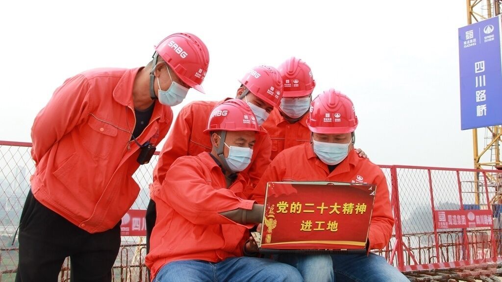 四川路桥建设集团有限公司泸州市纳溪河东长江大桥项目经理部的党员和建筑工人,收看党的二十大开幕会直播。(川观拍客 周超华 摄)