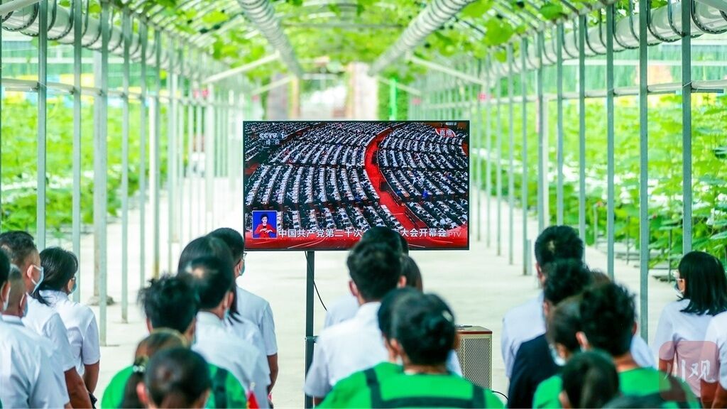 泸州市江阳区董允坝现代农业园区,产业工人们集中收看党的二十大开幕会直播。(川观拍客 刘学懿 摄)
