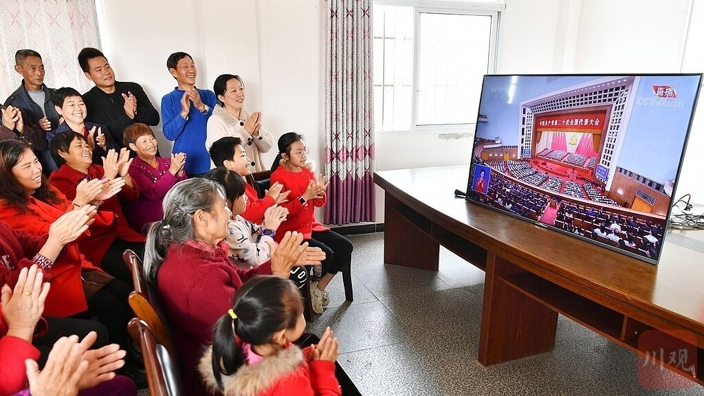 广安市前锋区观塘镇白云村村民在村活动室收看党的二十大开幕会直播。(川观拍客 张启富 摄)