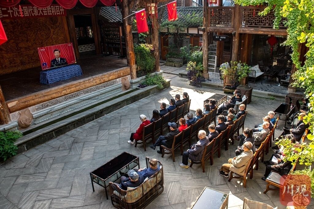 阆中市居民和游客在古城院落内收看党的二十大开幕会直播。(川观拍客 王玉贵 摄)