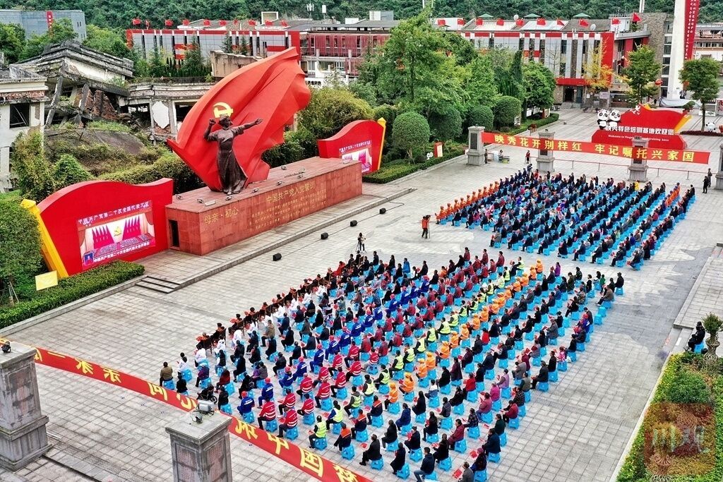 阿坝州汶川县映秀镇家国情怀宣誓广场上,藏羌回汉干部群众代表、部门行业及企业代表集中收看党的二十大开幕会直播。(四川在线记者 华小峰 摄)