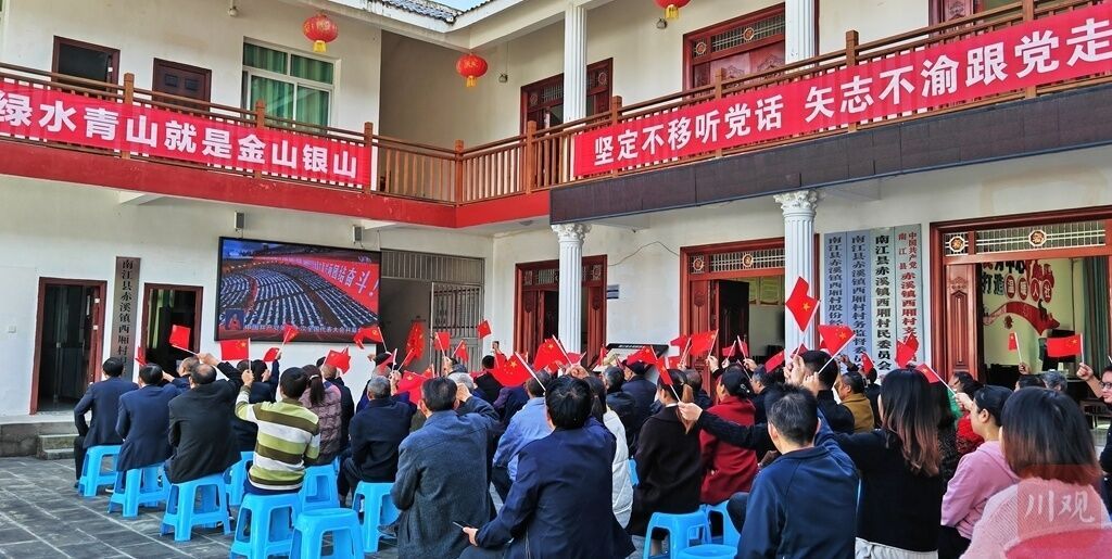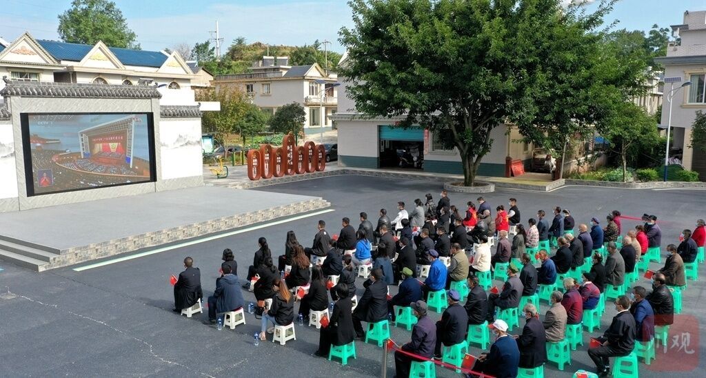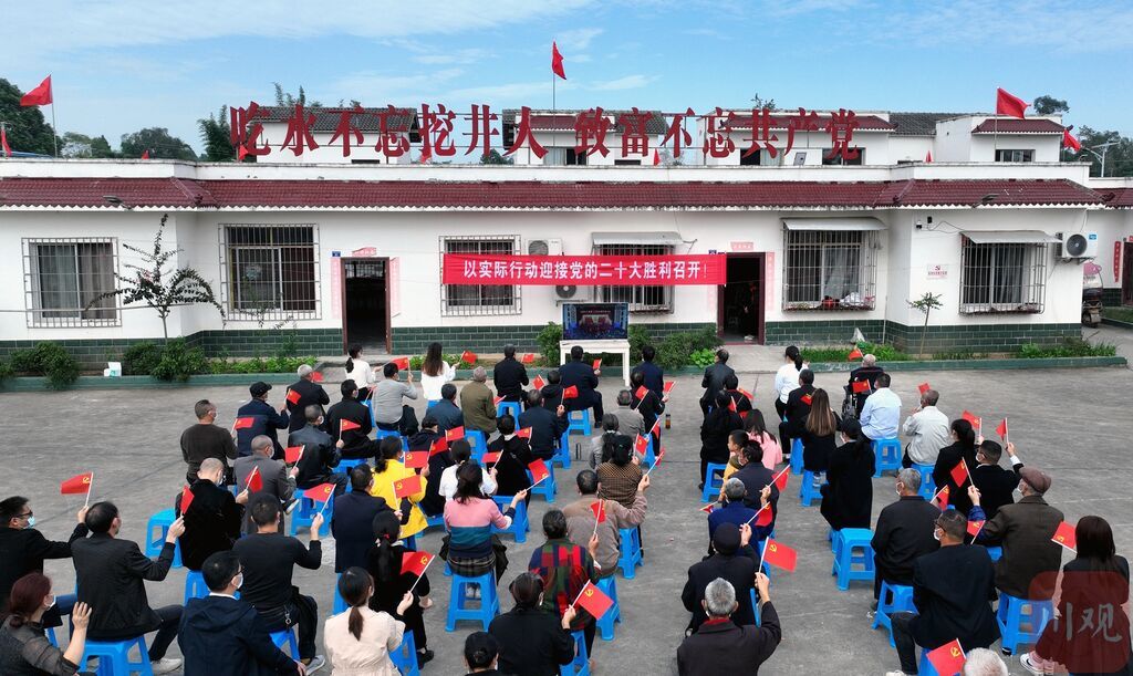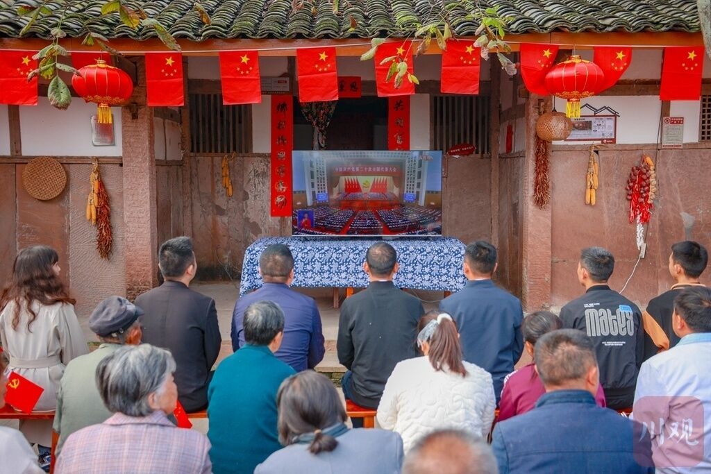 巴中市南江县赤溪镇西厢村的党员和村民围坐在村委大院,集中收看党的二十大开幕会直播。(川观拍客 肖定怀 摄)