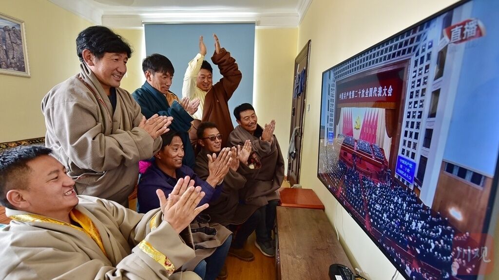阿坝州红原县龙日镇格玛村定居点,党员群众收看党的二十大开幕会直播。(川观拍客 贡波华清 摄)