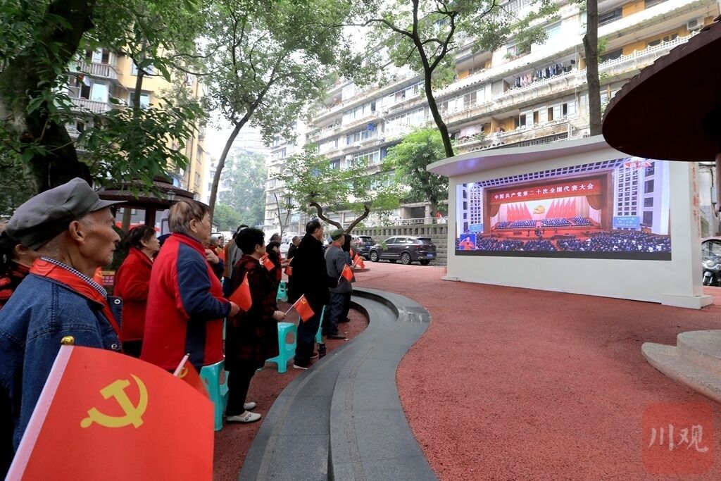泸州市纳溪区安富街道丙灵路社区党员群众在升级改造后的老旧小区大院,集中收看党的二十大开幕会直播。(川观拍客 廖胜春 摄)