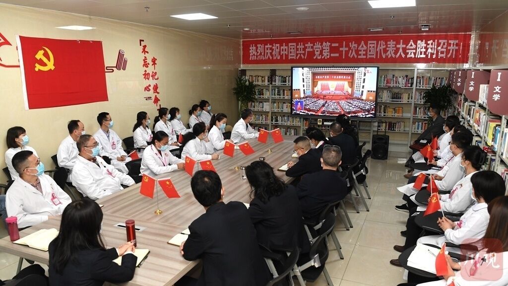 成都市妇女儿童中心医院党建学习室内,一线医务工作者们集中收看党的二十大开幕会直播。(四川在线记者 肖雨杨 摄)