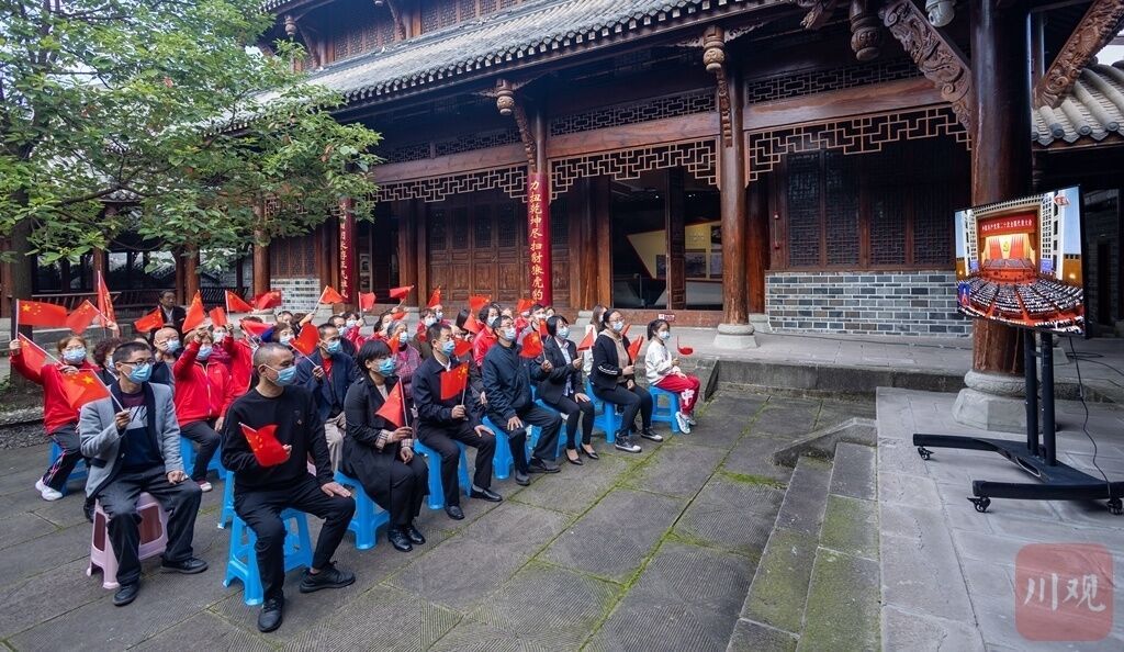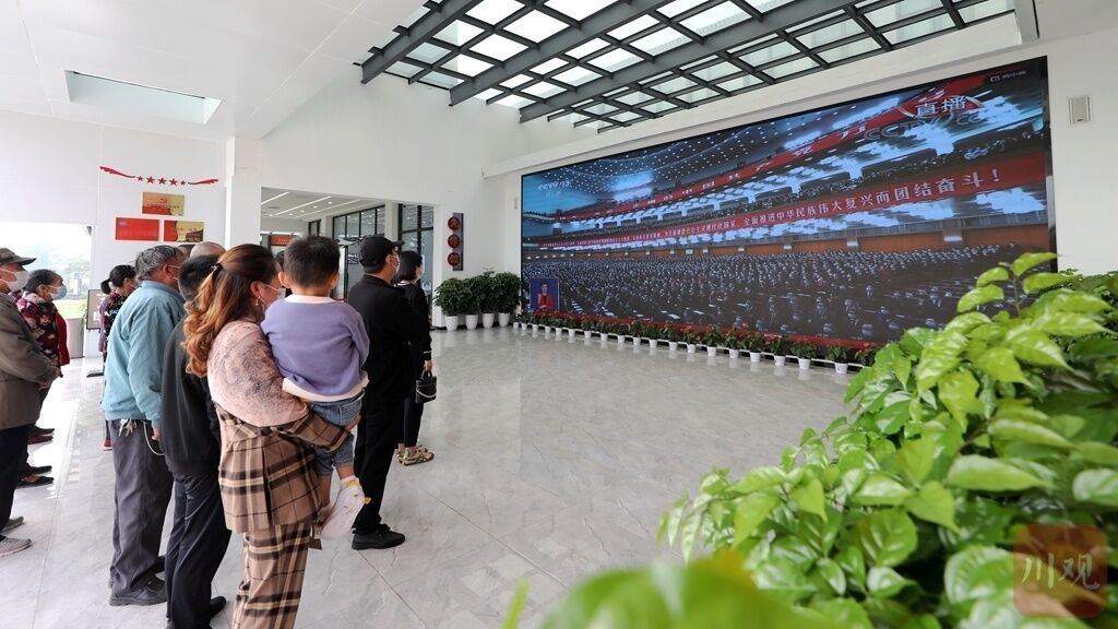 广元市旺苍县东河镇治城社区干部群众在红军城内集中收看党的二十大开幕会直播。(川观拍客 陈加普 摄)