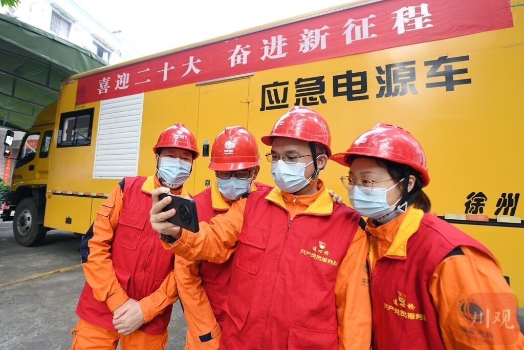国家电网四川电力广安连心桥共产党员服务队队员,在保电任务现场收看党的二十大开幕会直播。(川观拍客 康建林 摄)