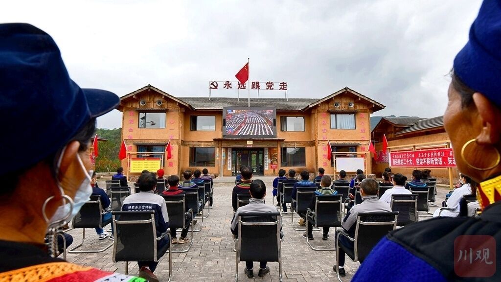 凉山州昭觉县三岔河乡三河村干部群众在广场集中收看党的二十大开幕会直播。(四川在线记者 王云 摄)