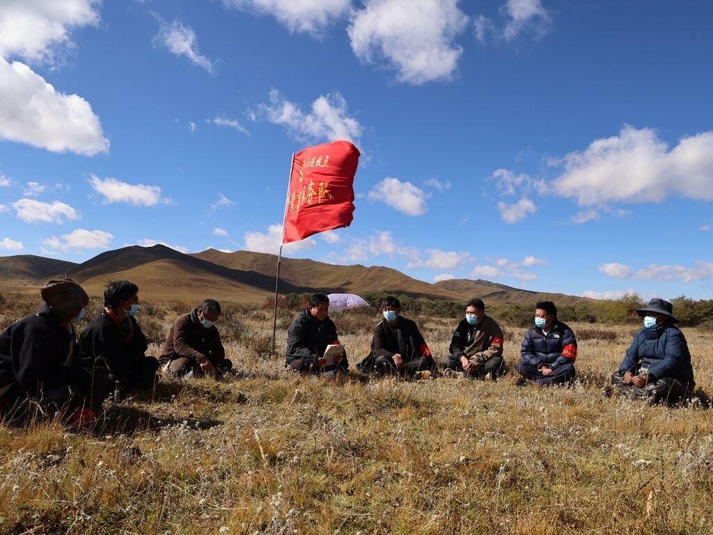10月20日,海拔3500多米的阿坝州阿坝县贾洛镇勒坤玛村一处远牧点上,清澈的贾曲河宛如一根飘带缓缓流向远方。河畔,帐篷边,10来个人盘腿坐成一圈,正在开展一场交流座谈会。