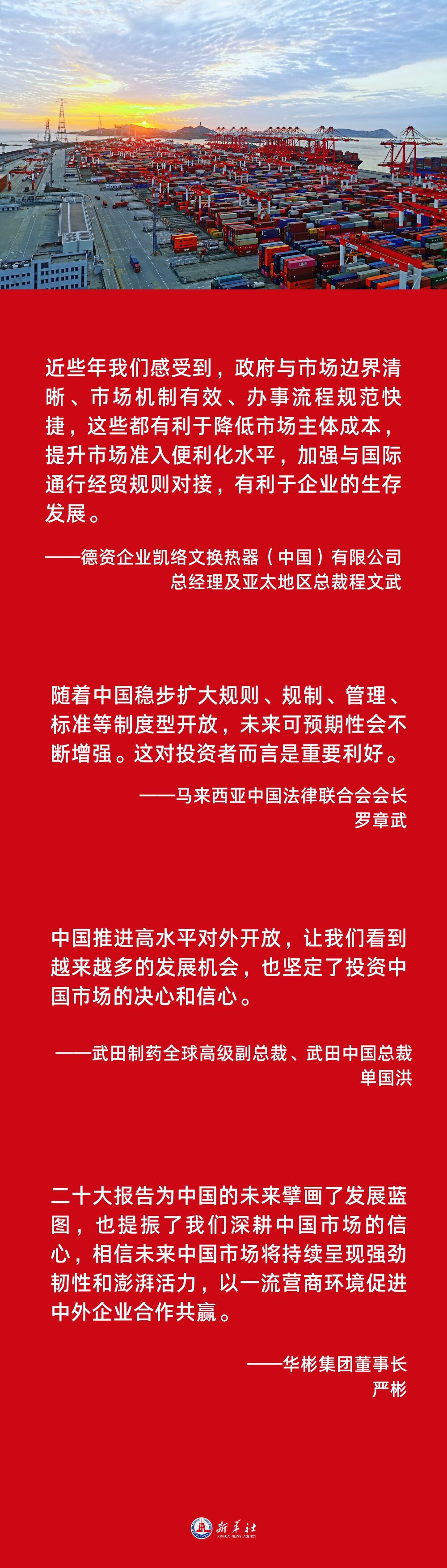 二十大报告中关于推进高水平对外开放的内容同样受到国际社会高度关注。全球工商界人士表示,中国营商环境持续改善,其进程令人振奋,中国稳步扩大制度型开放的前景让人期待。