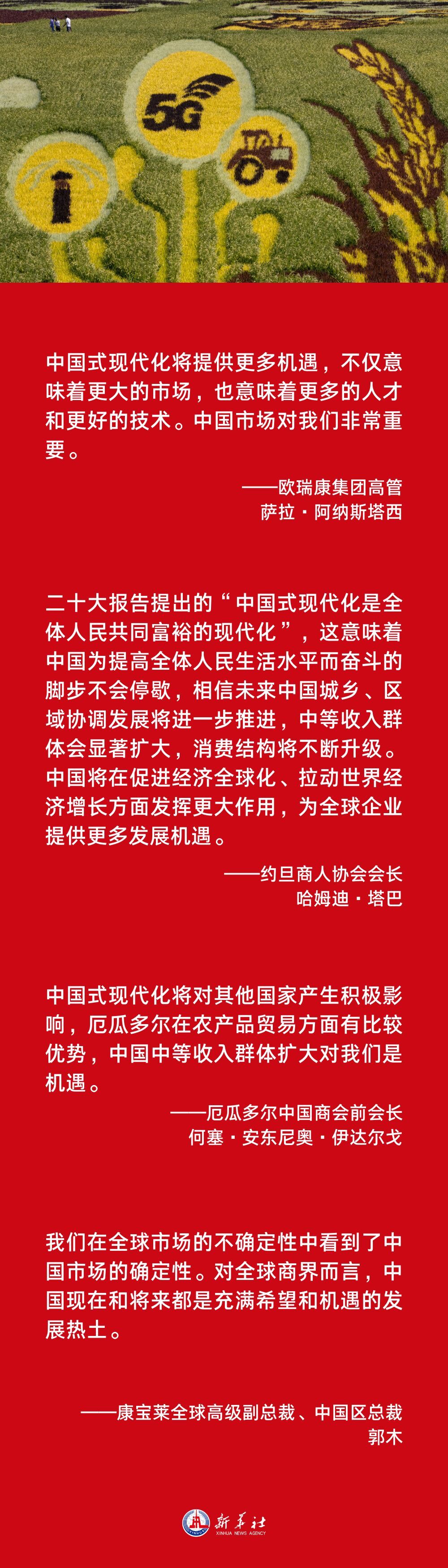 连日来,“中国式现代化”成为国际社会关注的热词。人口规模巨大的现代化,全体人民共同富裕的现代化,物质文明和精神文明相协调的现代化,人与自然和谐共生的现代化,走和平发展道路的现代化……在全球工商界人士眼中,中国式现代化也是世界的机遇。