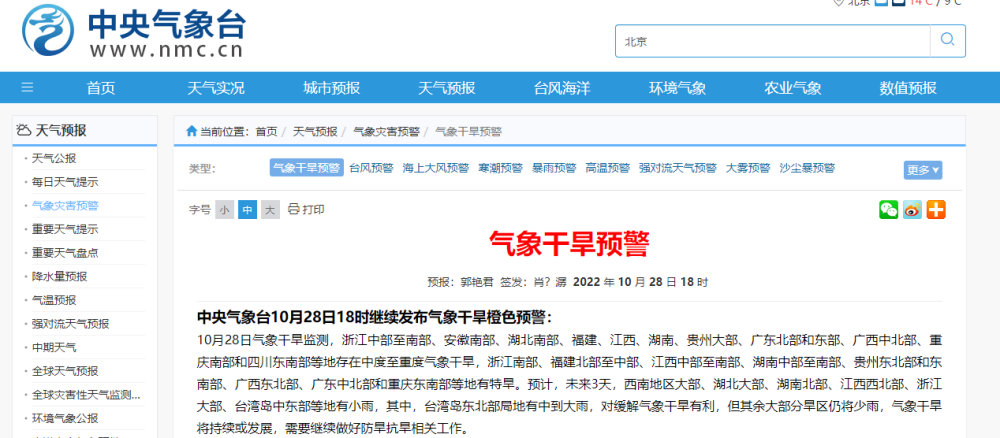中央气象台10月28日18时继续发布气象干旱橙色预警: