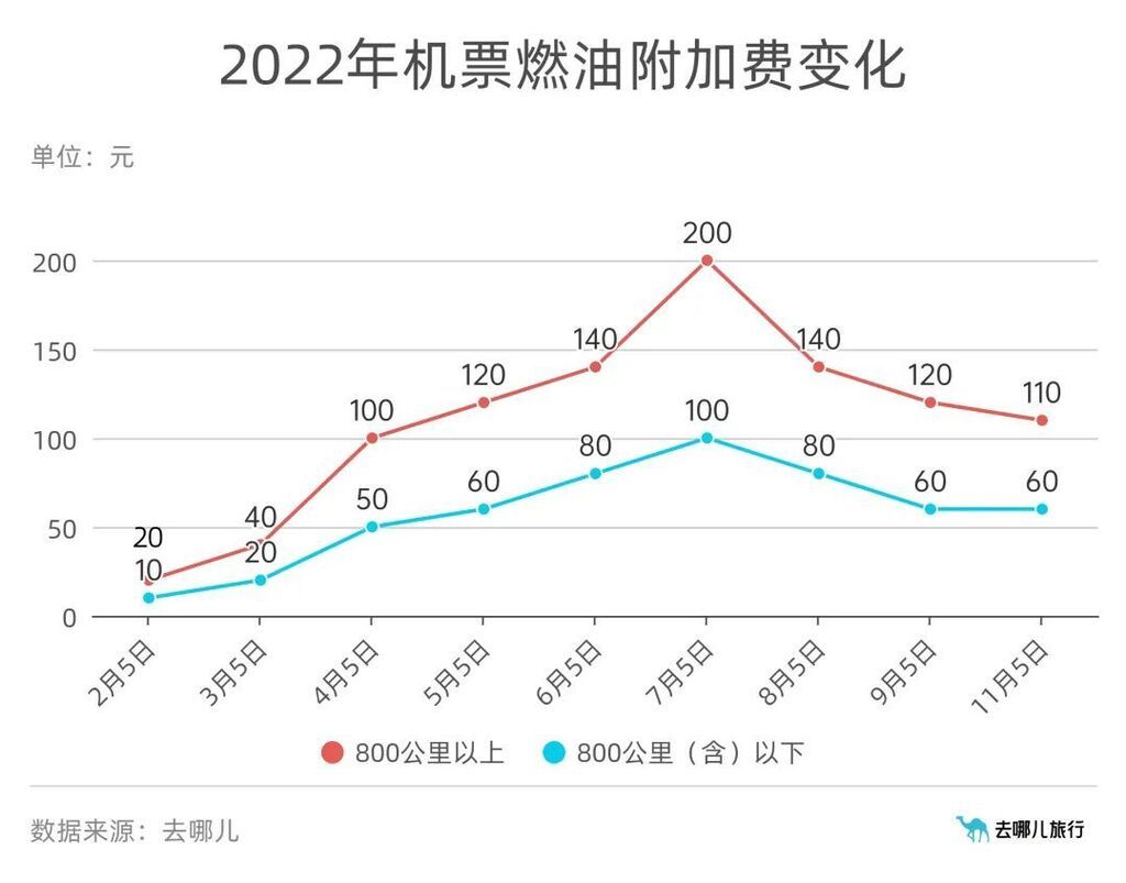10月31日,记者从“去哪儿”平台了解到,该平台已接到多家国内航空公司消息:自2022年11月5日(出票日期)起,调整国内航班燃油附加费征收标准,800公里以上航段降低10元。据悉,这是今年以来燃油附加费第三次下降。