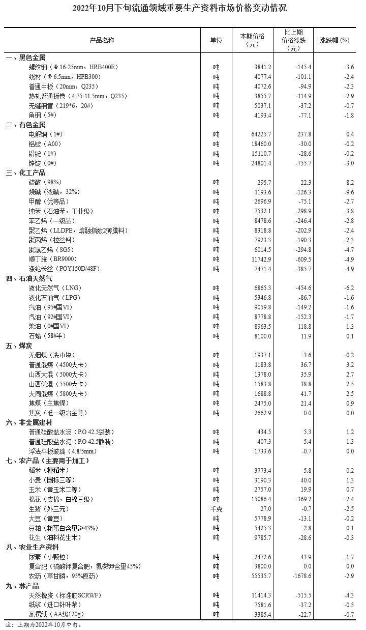 4日,国家统计局网站公布2022年10月下旬流通领域重要生产资料市场价格变动情况。