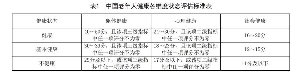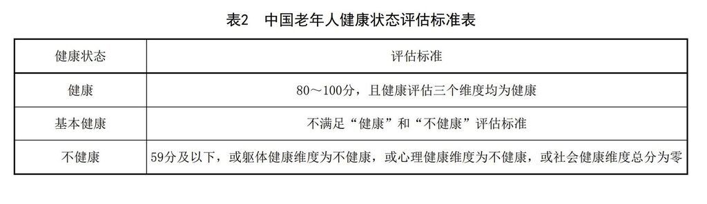 此外,国家卫健委为评估人员印发《中国健康老年人评估表》《中国老年人健康各维度状态评估标准表》《中国老年人健康状态评估标准表》《中国健康老年人相关指标评估量表》等表单,规范评估标准。评估人员通过询问评估对象或其照顾者,填写《中国健康老年人评估表》中的内容,按照该表中“评估项目”进行逐项评估,填写每个三级指标评分,并计算躯体健康、心理健康、社会健康每个维度的分值,再参考《中国老年人健康各维度状态评估标准表》为3个维度进行健康状态评估。最终,中国老年人健康状态评估总分为躯体健康、心理健康、社会健康3个维度的评分之和,80至100分且健康评估3个维度均为“健康”的老年人,可评估为健康老年人;不满足“健康”和“不健康”评估标准的老年人评估为基本健康;59分及以下,或躯体健康维度为不健康,或心理健康维度为不健康,或社会健康维度总分为零的老年人为不健康状态。