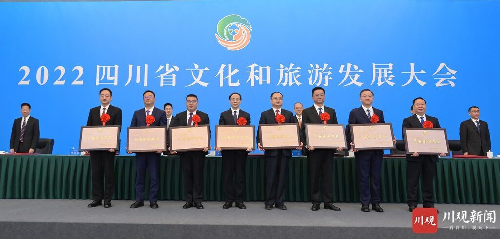 会上,省委常委、宣传部部长郑莉宣读第四批天府旅游名县、第四批天府旅游名县候选县、2022年“金熊猫”奖先进集体和先进个人、第二批天府旅游名牌、第三批文化旅游产业优秀龙头企业、前三批天府旅游名县年度考评表现突出单位名单。王晓晖、黄强等向获奖者代表授牌颁奖。阆中市、通江县、犍为县罗城镇综合文化站、明宇实业集团、广安市广安区协兴镇作交流发言。