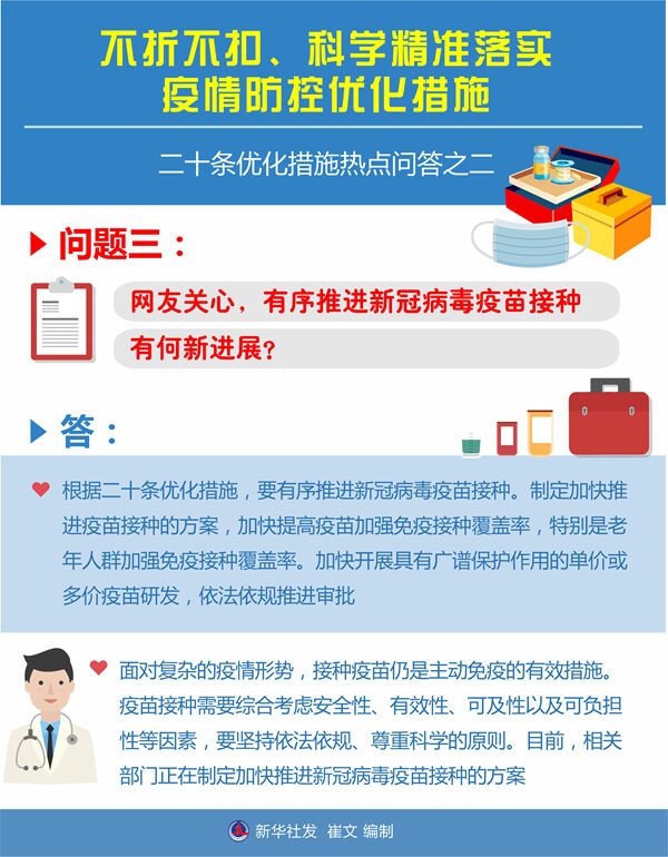 答:根据二十条优化措施,要有序推进新冠病毒疫苗接种。制定加快推进疫苗接种的方案,加快提高疫苗加强免疫接种覆盖率,特别是老年人群加强免疫接种覆盖率。加快开展具有广谱保护作用的单价或多价疫苗研发,依法依规推进审批。