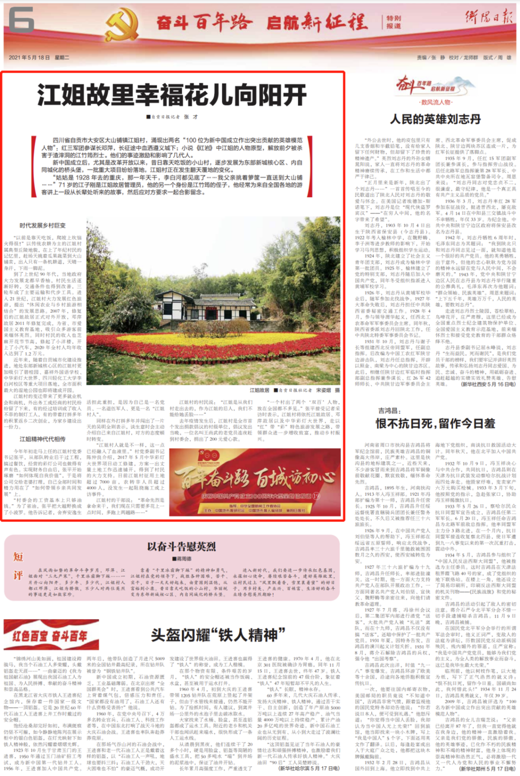 近日,第32届中国新闻奖评选结果公布,由中国记协指导、中国地市报研究会组织策划、自贡日报社等全国105家地市党报联袂推出的《百年奋斗路·百城访初心——庆祝中国共产党成立100周年“红色百城”大型全媒体报道》,荣获第32届中国新闻奖二等奖。自贡日报社等全国105家地市党报集体获奖。本报推出的作品为《江姐故里幸福花儿向阳开》。
