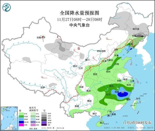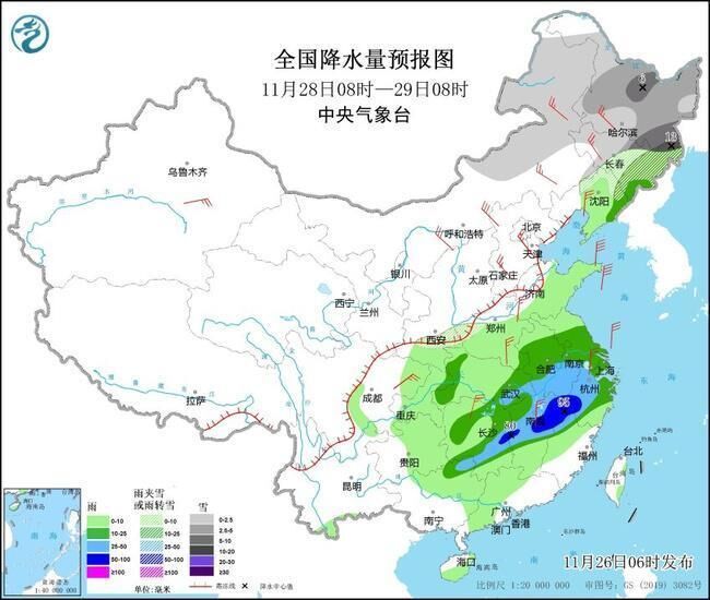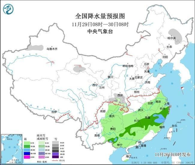 11月30日至12月1日,江汉、江淮、江南北部等地有降雪或雨夹雪,贵州、湖南、江西北部等地部分地区有冻雨,南方其他地区降雨持续。