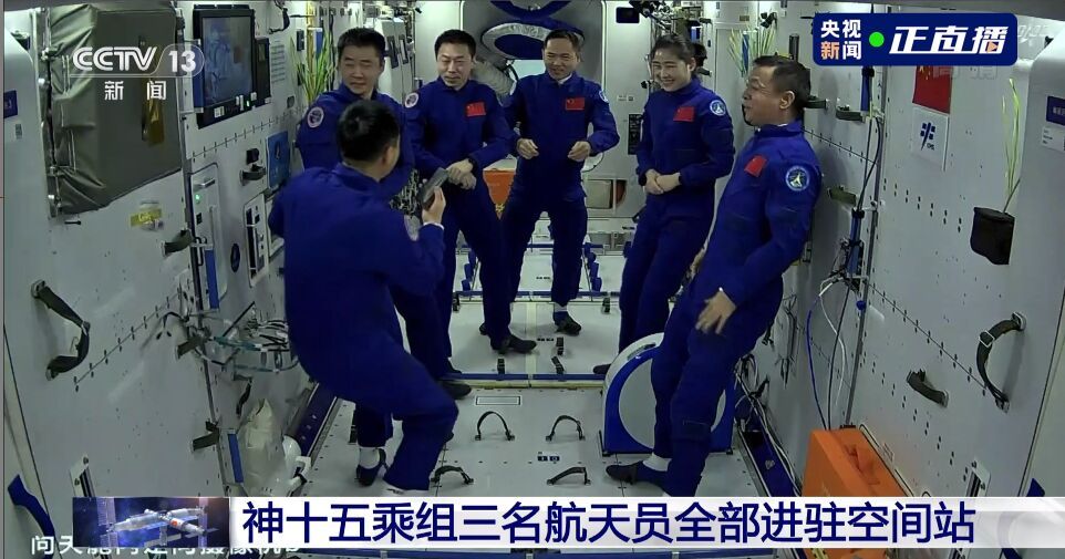 【神十五航天员顺利进驻中国空间站】神舟十五号3名航天员顺利进驻中国空间站,两个航天员乘组首次实现“太空会师”。(记者:黄明 李国利 张汨汨)