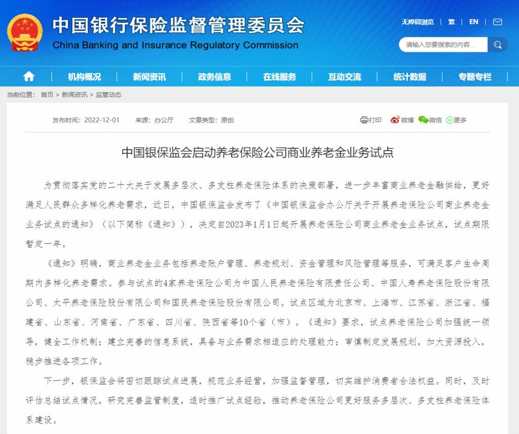 近日,中国银保监会发布了《中国银保监会办公厅关于开展养老保险公司商业养老金业务试点的通知》(以下简称《通知》),决定自2023年1月1日起开展养老保险公司商业养老金业务试点,试点期限暂定一年。