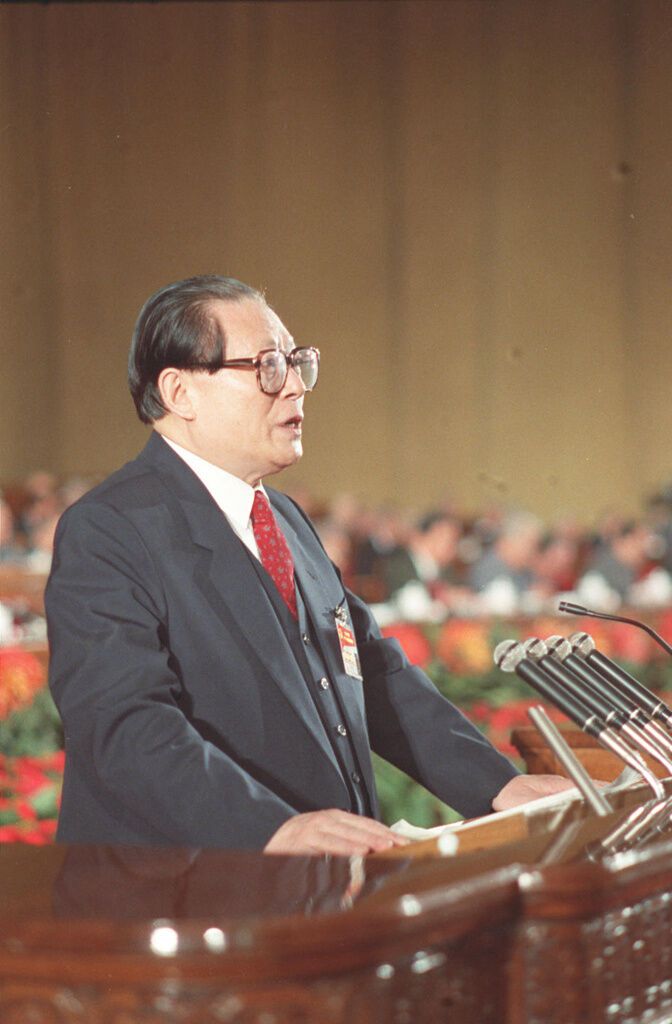 1997年9月12日,中国共产党第十五次全国代表大会在北京人民大会堂开幕。这是江泽民同志代表第十四届中央委员会作报告。新华社发