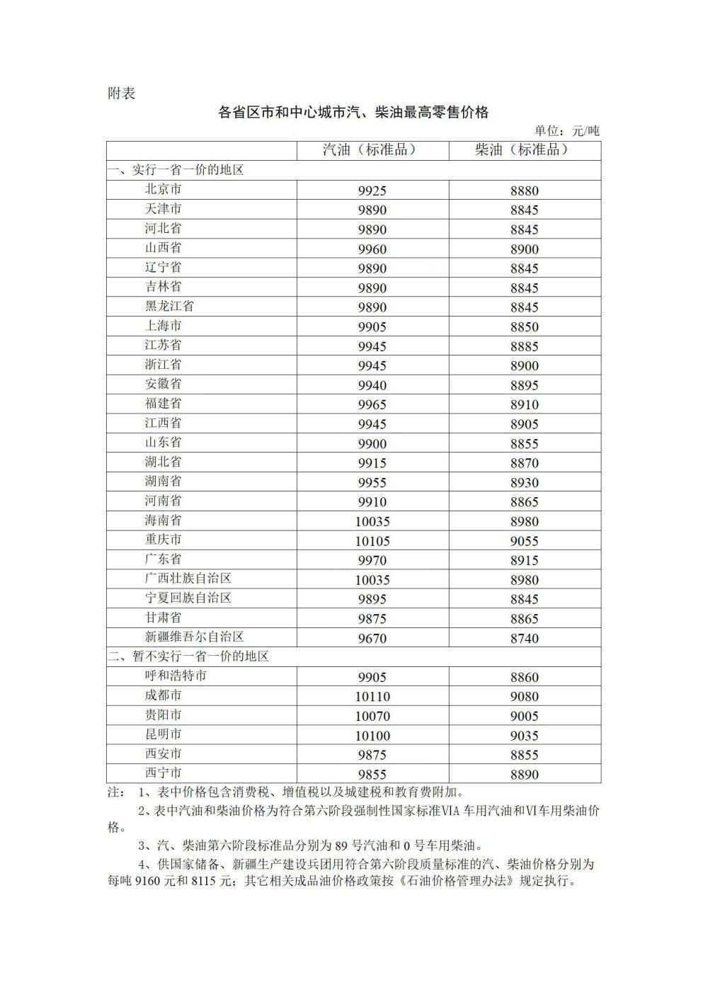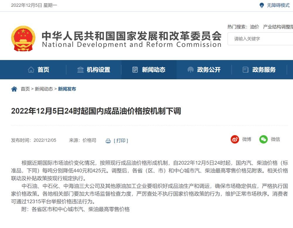 根据近期国际市场油价变化情况,按照现行成品油价格形成机制,自2022年12月5日24时起,国内汽、柴油价格(标准品,下同)每吨分别降低440元和425元。调整后,各省(区、市)和中心城市汽、柴油最高零售价格见附表。相关价格联动及补贴政策按现行规定执行。