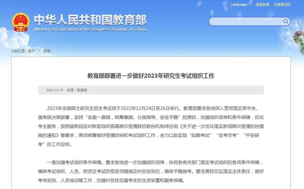 据教育部网站消息,2023年全国硕士研究生招生考试将于2022年12月24日至26日举行。教育部要求各地深入贯彻落实党中央、国务院决策部署,坚持“全国一盘棋,统筹兼顾、分类指导、安全平稳”的原则,加强组织领导和条件保障,优化考生服务,按照国务院应对新型冠状病毒肺炎疫情联防联控机制综合组《关于进一步优化落实新冠肺炎疫情防控措施的通知》等要求,高效统筹做好疫情防控和考试组织工作,全力以赴实现“如期考试”“应考尽考”“平安研考”的工作目标。
