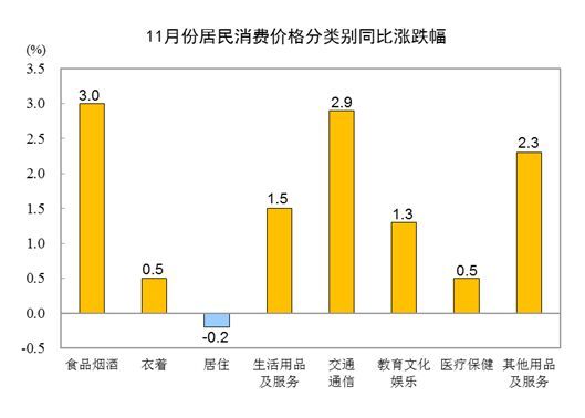 11月份,食品烟酒类价格同比上涨3.0%,影响CPI(居民消费价格指数)上涨约0.85个百分点。食品中,畜肉类价格上涨17.6%,影响CPI上涨约0.56个百分点,其中猪肉价格上涨34.4%,影响CPI上涨约0.47个百分点;蛋类价格上涨9.9%,影响CPI上涨约0.07个百分点;鲜果价格上涨9.6%,影响CPI上涨约0.18个百分点;水产品价格上涨3.4%,影响CPI上涨约0.06个百分点;粮食价格上涨3.0%,影响CPI上涨约0.05个百分点;鲜菜价格下降21.2%,影响CPI下降约0.53个百分点。