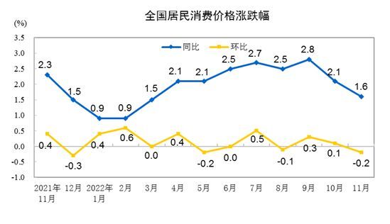 2022年11月份,全国居民消费价格同比上涨1.6%。其中,城市上涨1.5%,农村上涨1.7%;食品价格上涨3.7%,非食品价格上涨1.1%;消费品价格上涨2.3%,服务价格上涨0.5%。1—11月平均,全国居民消费价格比上年同期上涨2.0%。