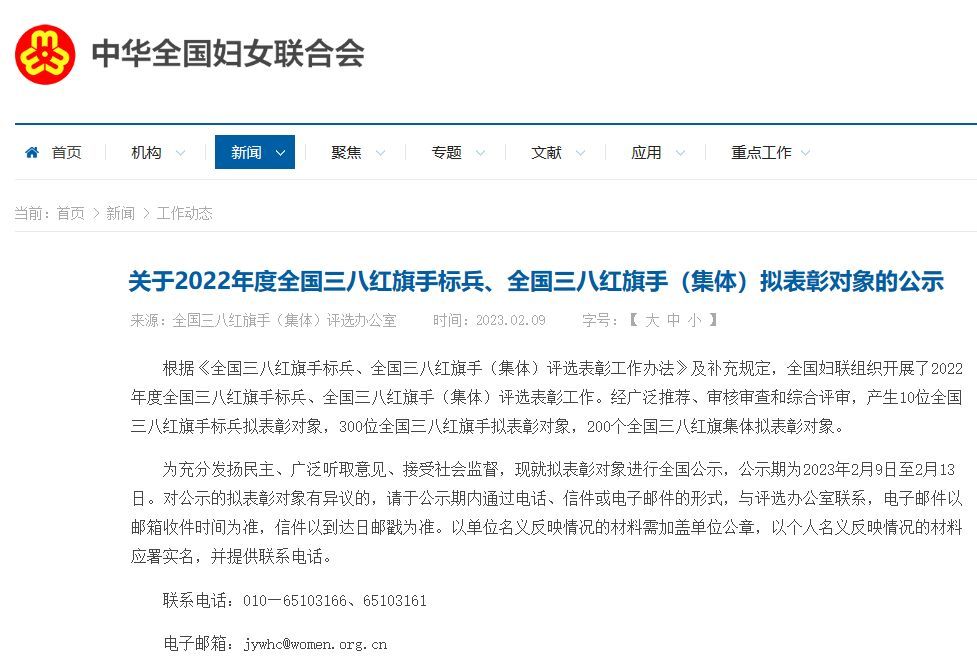 2月9日,中华全国妇女联合会发布“关于2022年度全国三八红旗手标兵、全国三八红旗手(集体)拟表彰对象的公示”。