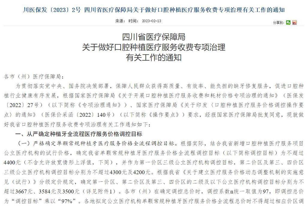 四川医保局2月13日发布《关于做好口腔种植医疗服务收费专项治理有关工作的通知》(以下简称《通知》),要求从严确定种植牙全流程医疗服务价格调控目标,其中成都单颗最高不超过4400元。