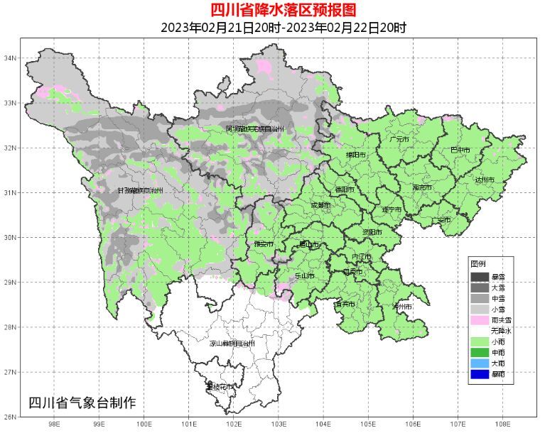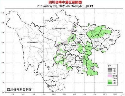 20日晚上到21日白天,盆地各市阴天有小雨,盆周山区有雨夹雪或小雪;川西高原多云间阴,阿坝州大部和甘孜州西北部有分散阵雪(雨),个别地方有中雪,攀西地区大部多云间晴。