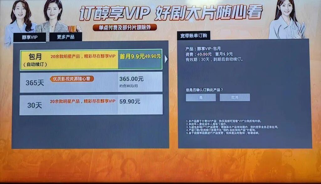 “其实现在人们看电视的频率已经不高了,就是偶尔看看。孩子想看个动画电影,结果点进去以后要收费,而且只给3个选项:包月(自动续订)、包月、包年。包年是365元,包月是59.9元。”因为找不到单个电影付费的选项,王女士只好选择了59.9元的包月服务。其实孩子在剩下的29天会员期里,再也没有打开过电视。