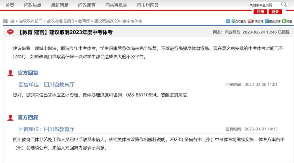 近日,有家长通过问政四川理政平台提问,学生阳康后身体尚未完全恢复,不敢进行高强度体育锻炼。现在距离之前安排的中考体考时间已不足两月,如果更改体考项目或取消任何一项,对学生都会造成更大的不公平性,因此建议取消今年中考体考。
