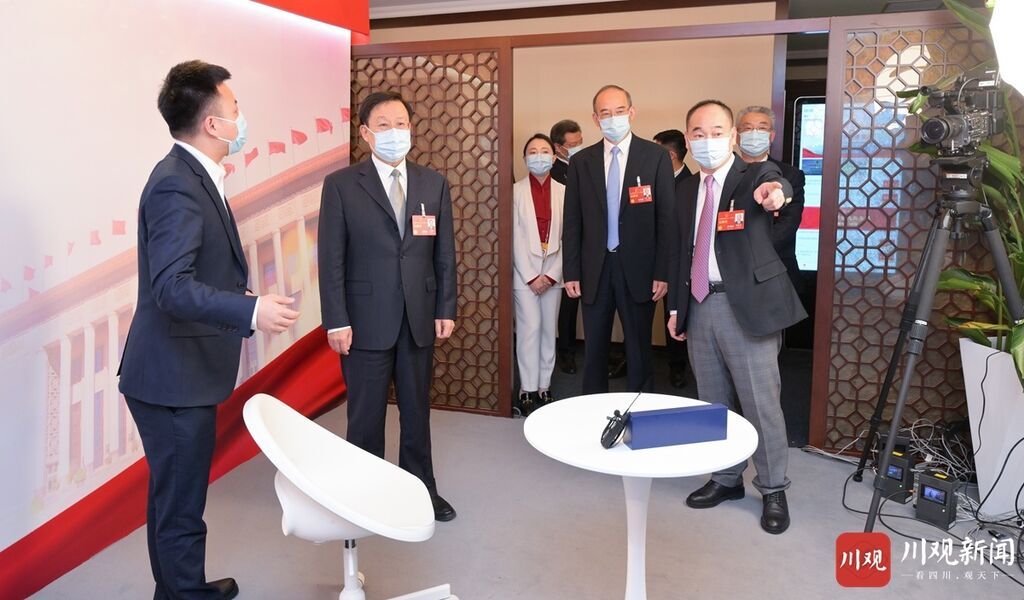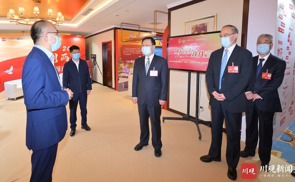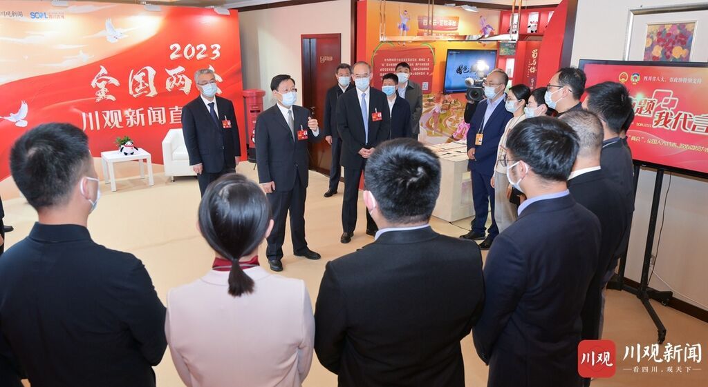 王晓晖、黄强先后来到四川广播电视台和四川日报设在驻地的演播厅,与记者代表一一握手,对大家的辛勤付出表示感谢,和大家亲切交流,饶有兴致地察看全国两会报道作品、新媒体技术应用演示、特色文创产品展陈等,仔细听取中央有关媒体和我省主要媒体全国两会宣传报道总体情况介绍,对各媒体充分发挥各自优势、深入运用媒体融合成果、全方位展现四川代表委员履职风采的做法成效给予肯定。王晓晖说,此次赴京采访人员有限,驻地的每位记者都是精兵强将,“以一当十”全情投入采访报道,十分辛苦。后方团队提供了有力支撑,通过策划引领、云端连线等方式,建立了前后方协同高效推进全国两会宣传报道的工作格局。总的来看,重点选题站位高、融媒产品有新意、主题报道接地气,全面反映了大会盛况,充分展示了四川代表委员的良好形象,较好地讲述了四川故事、传递了四川声音。