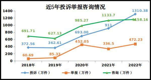 据市场监管总局网站消息,2022年,全国市场监管部门通过全国12315平台、电话、传真、窗口等渠道共受理消费者投诉、举报和咨询2940.77万件,同比增长23.5%。其中,投诉1310.38万件,举报472.23万件,为消费者挽回经济损失45.19亿元,有力保护了消费者合法权益。主要呈现十大特点: