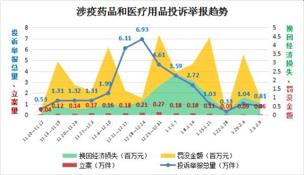 “二十条”和“新十条”出台后,疫情防疫重心从防控感染转到医疗救治,涉疫药品和医疗用品需求激增、供应不畅,价格异常波动、产品质量问题频现,相关投诉举报咨询量一度呈井喷式增长。2022年11月10日至2022年底,全国12315平台接收相关投诉举报24.11万件,同比增长3.88倍,环比增长2.95倍,最高峰值达到19.5倍。其中,投诉14.18万件,举报9.93万件,挽回经济损失498.17万元。