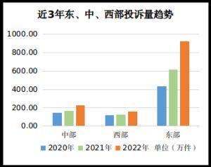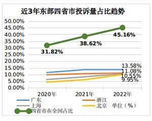 从近三年趋势看,因平台经济的跨区域扩张、人口资本的跨区域流动、市场要素的跨区域配置,广东、浙江、上海、北京4个省市的消费正在加速集聚。消费投诉数量与消费活跃水平呈正相关关系,四省市消费投诉数量在全国的占比从2020年的31.8%增长到2022年的45.16%。消费投诉的加速集聚在一定程度上反映了消费供给侧发展的不平衡,需要进一步恢复和扩大中西部地区消费,推动更高质量、更加平衡的发展。