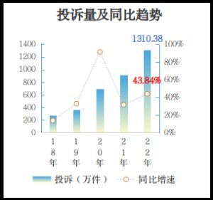 2022年,全国市场监管部门受理消费者投诉1310.38万件,同比增长43.84%,增速较2021年有所放大。从投诉问题看,质量298.70万件、售后服务248.96万件、合同115.91万件、食品安全109.06万件,合计占投诉的58.96%。其中,售后服务问题增长最快,群众反映最强烈,同比增长57.67%。