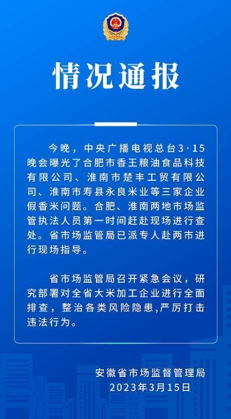 当晚,安徽省市场监管局发布情况通报称,中央广播电视总台3·15晚会曝光了合肥市香王粮油食品科技有限公司、淮南市楚丰工贸有限公司、淮南市寿县永良米业等三家企业假香米问题,合肥、淮南两地市场监管执法人员第一时间赶赴现场进行查处。安徽省市场监管局已派专人赴两市进行现场指导。通报还称,安徽省市场监管局召开紧急会议,研究部署对全省大米加工企业进行全面排查,整治各类风险隐患,严厉打击违法行为。