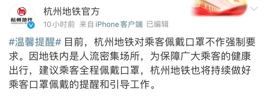 据多家媒体报道,目前上海、广州、南京、西安、杭州等多个城市的地铁,仍建议和倡导市民在乘坐时佩戴口罩,但不作强制要求。