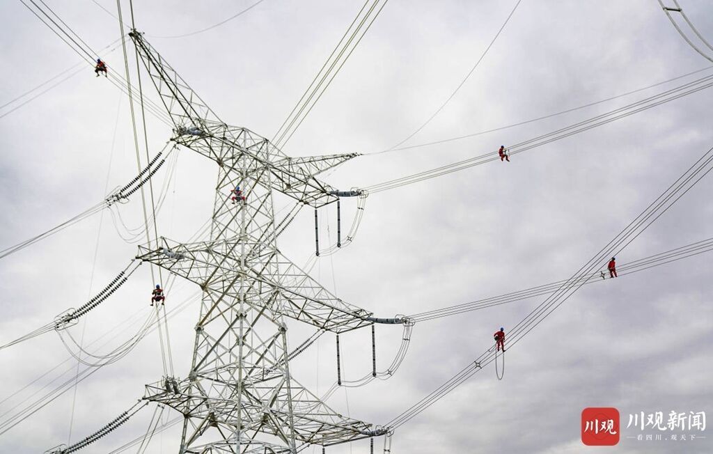 位于天府新区眉山片区视高街道的尖山—彭祖500千伏线路加装串抗工程,建成后将增加供电能力150万千瓦,是提升成都地区迎峰度夏和大运会保电能力的关键工程,图为电力工人正在高空作业。