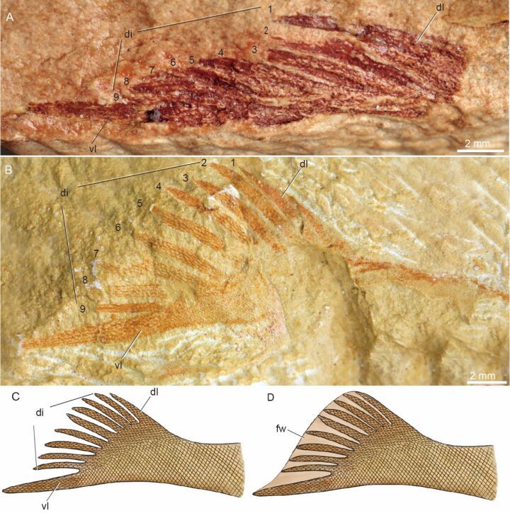 九尾狐甲鱼特异保存的“九指分叉”的尾鳍。(中科院古脊椎所供图)