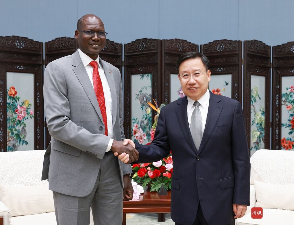 4月17日,省委书记王晓晖在成都会见南苏丹苏丹人民解放运动总书记拉姆率领的苏人解干部考察团一行。