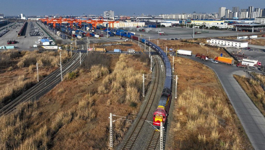 2023年2月14日,一列满载货物的中欧班列(成渝)从成都国际铁路港驶出。 白桂斌 摄
