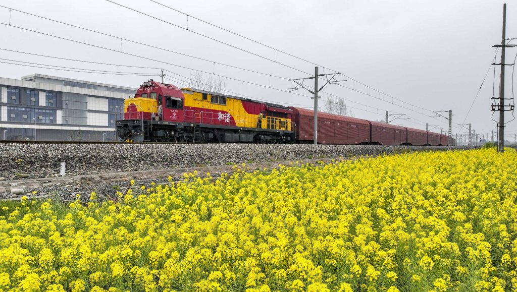 2023年3月16日,成都国际铁路港周边的油菜花竞相绽放,春意盎然。一列列火车穿行其中,犹如“开往春天的列车”。 白桂斌 摄
