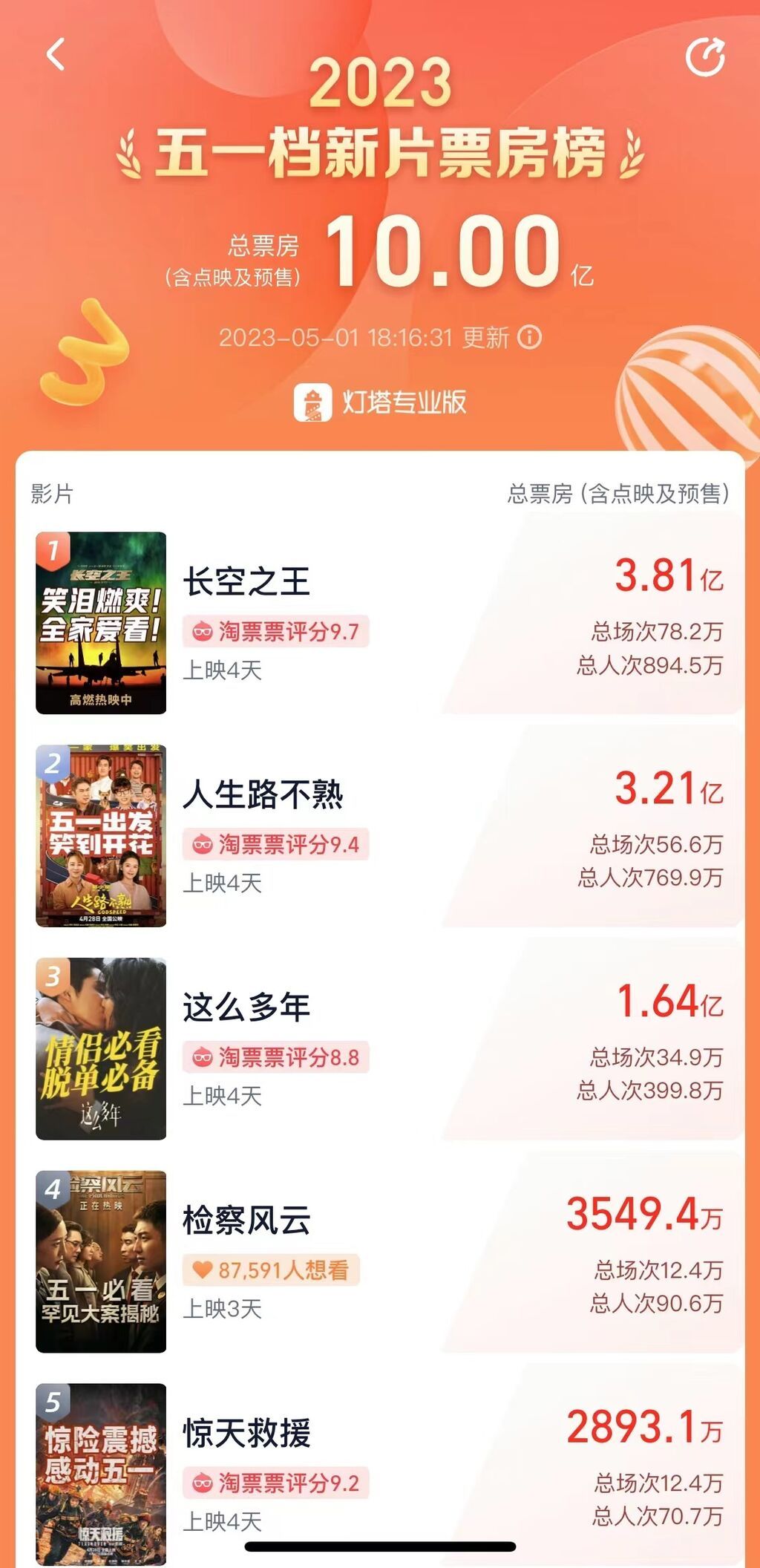 根据灯塔专业版数据,截至5月1日18时16分,2023年五一档新片总票房突破10亿元,其中票房排名前三的影片分别是《长空之王》《人生路不熟》《这么多年》。