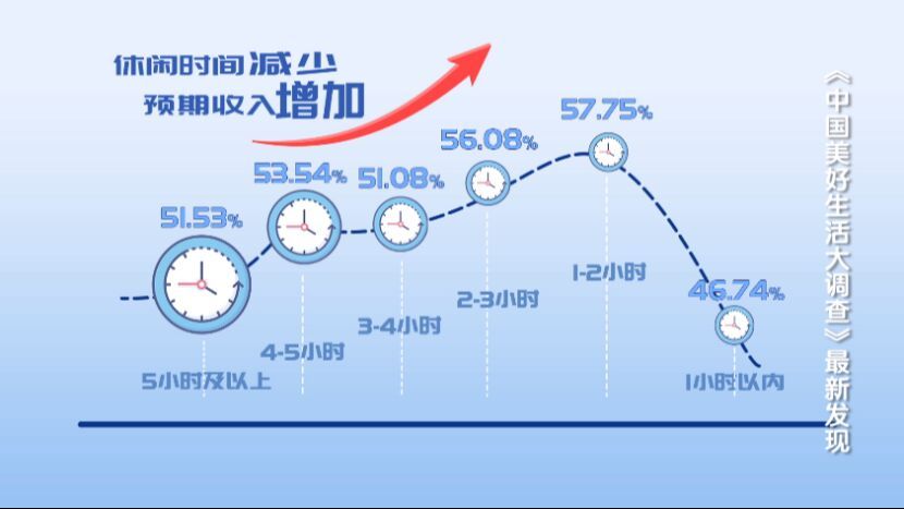都说时间就是金钱,忙碌的人收入预期真的会增加吗?这是大概率情况哦。大调查发现,除了休闲时间在1小时以内的人群外,从整体来看,随着休闲时间的减少,预期收入会增加的比例在增加。充实的工作可能会让人们更有收入的安全感。