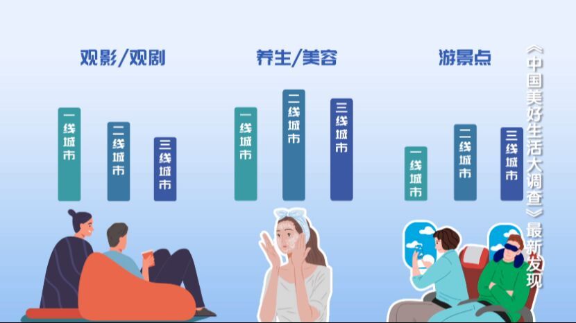 从不同类型城市来看,休闲时间,一线城市观影、观剧的比例超过二三线城市的人;二三线城市的人养生、美容,游景点的比例略高于一线城市的人。而无论人们身处哪个类型的城市,对聚餐、夜宵,逛博物馆、逛展的喜爱都相差不大。